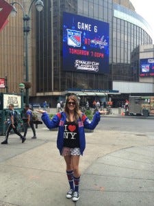 Taylor, the ultimate NY Rangers fan, outside of Madison Square Garden